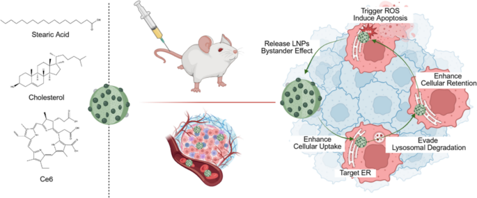 癌症治疗中传统药物存在半衰期短、需频繁给药的问题,本研究开发胆固醇基脂质纳米颗粒(Cls-LNPs)作为内源性药物储库,增强细胞摄取与滞留,并与光动力疗法(PDT)联用,通过诱导内质网应激、脂质过氧化及凋亡机制,在体内外实验中显著提升抗肿瘤效果并产生旁观者效应。