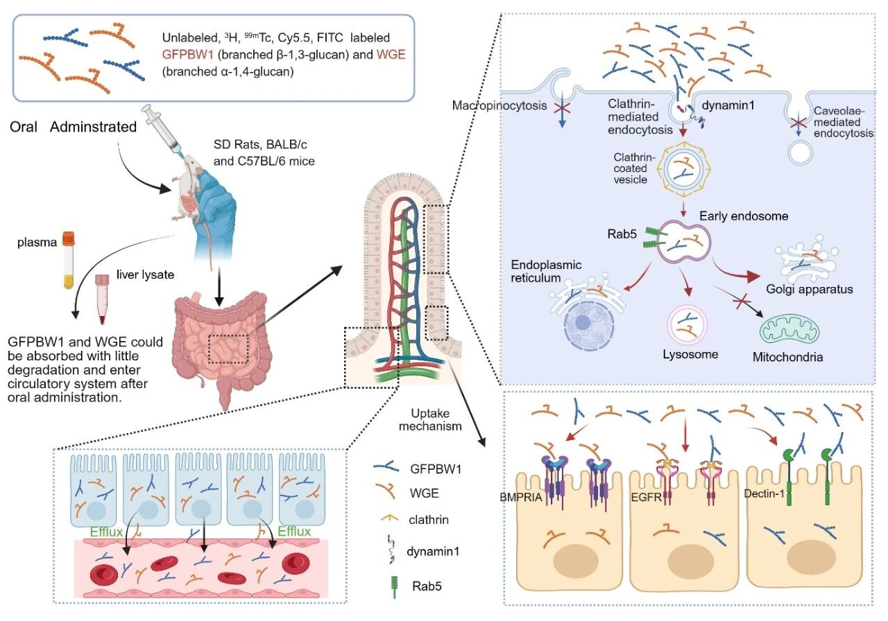 随后,该研究以灰树花来源的带支链β-1,3-葡聚糖GFPBW1和天麻来源带支链的α-1,4-葡聚糖WGE作为模型多糖,综合运用未标记、同位素标记(99mTc、3H)及荧光标记(Cy5.5, FITC)三种独立策略,发现天然多糖经大鼠和小鼠口服后能以大分子形式进入血液循环及肝脏, 并分布于肝脏,肾脏,胆囊等器官。研究通过抑制剂处理、免疫荧光染色及基因敲减实验,揭示天然多糖在肠道上皮细胞中的摄取依赖于由网格蛋白(CLTC)、动力蛋白1(DNM1)及Rab5介导的内吞途径,且被细胞摄取后的多糖主要定位于早期内含体、高尔基体、内质网及溶酶体。