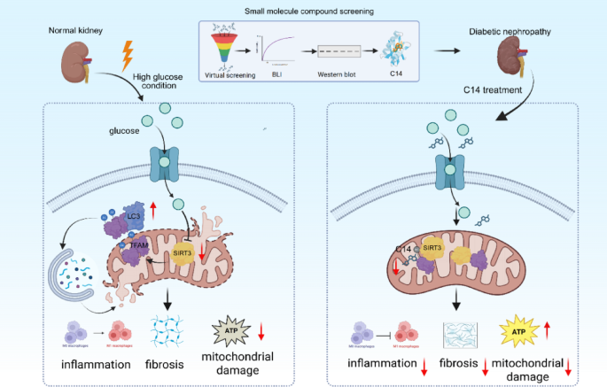 糖尿病肾病中TFAM K76乙酰化通过抑制氧化磷酸化和过度激活自噬加剧肾损伤,鉴定新型抑制剂C14有效改善损伤。