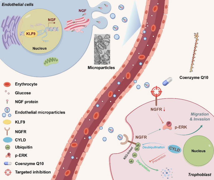 妊娠期糖尿病(GDM)患者血浆中内皮微颗粒(EMPs)水平显著升高,并通过激活NGFR-CYLD信号通路促进滋养层细胞异常迁移和胎盘过度生长。机制研究显示高血糖通过激活KLF9诱导NGF上调,其包裹于EMPs中与胎盘NGFR结合,抑制CYLD对NGFR的泛素化降解,进而激活MAPK/ERK通路。辅酶Q10通过直接靶向NGFR阻断此通路,有效缓解GDM相关胎盘异常。