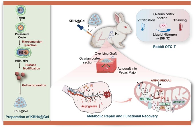 卵巢组织移植中缺血再灌注损伤通过新型氢释放纳米材料KBH?@Gel调控抗氧化代谢和血管生成,显著提升移植存活率。