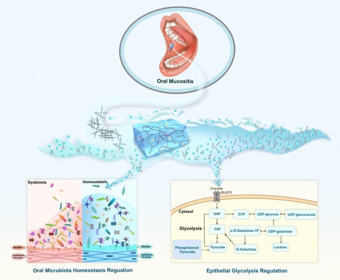 口腔黏膜炎(OM)患者化疗后普遍出现,其病理机制与口腔微生物群失调及宿主代谢紊乱相关。研究提出新型CP@ZS-NDs纳米平台,通过改善微生物群平衡调控宿主糖代谢及Integrin α3β1-Fak-Rac1信号轴,抑制UDP-半乳糖代谢通路,促进OM愈合并维持微生物群稳态。