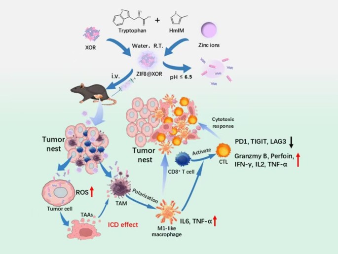 胃癌免疫治疗纳米平台ZIF-8@XOR通过XOR催化生成高浓度活性氧,靶向诱导肿瘤细胞凋亡并激活M1型巨噬细胞,促进CD8+ T细胞浸润及抗肿瘤免疫应答。