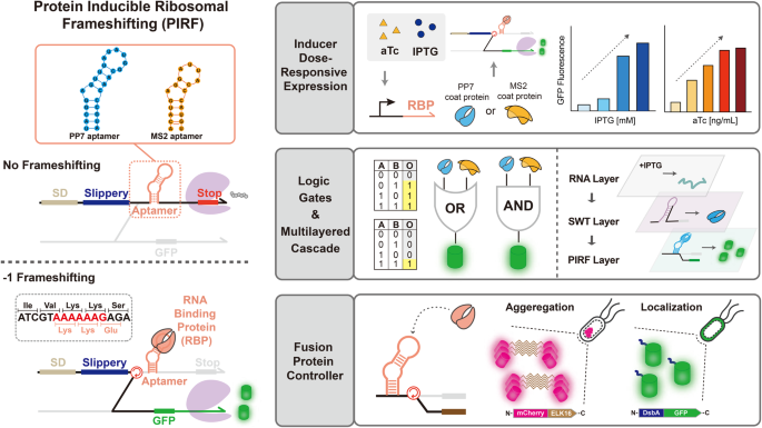 本研究介绍了一种合成翻译调控平台——蛋白质诱导的核糖体移码(PIRF),该平台通过将适配体-蛋白质相互作用与-1 PRF基序结合,在大肠杆菌(Escherichia coli)中实现受调控的翻译。PIRF模块能够响应细胞内的RNA结合蛋白(如PP7和MS2),以条件依赖的方式触发移码。PIRF可以通过依赖阅读框的翻译来编程逻辑门操作,并在合成电路中实现多层次调控。此外,灵活的PIRF设计通过策略性地定位肽标签和蛋白质编码序列,实现了对融合蛋白表达、蛋白质聚集和周质定位的阅读框依赖性控制。虽然PIRF能够实现受调控的移码,并且可以灵活地配置用于各种电路和应用,但通常会观察到一定程度的基础移码现象,这可能需要未来的进一步优化策略。总体而言,PIRF支持对下游蛋白质表达的可编程和逻辑控制,包括条件依赖性的聚集和受调控的亚细胞定位。