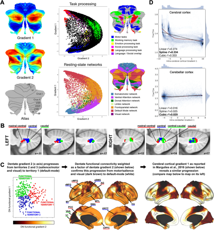 脊髓、初级运动皮层和运动丘脑与小脑皮层小叶 I-VI 和 VIII 相连,这些区域在人类fMRI运动任务中被激活。两个运动表征区(小叶 I-VI 和小叶 VIII)之后,存在着从小叶 I-VI 向 Crus I(第一个非运动表征区)、从小叶 VIII 向 VIIB 和 Crus II(第二个非运动表征区)、以及从小叶 VIII 向 IX 和 X(第三个非运动表征区)延伸的运动离心梯度。小脑皮层组织的这种运动离心梯度与大脑皮层的梯度相呼应,从初级运动处理向单模态联合功能,再到多模态联合功能推进。小脑齿状核 (DN) 中也观察到类似的功能异质性和梯度排序。