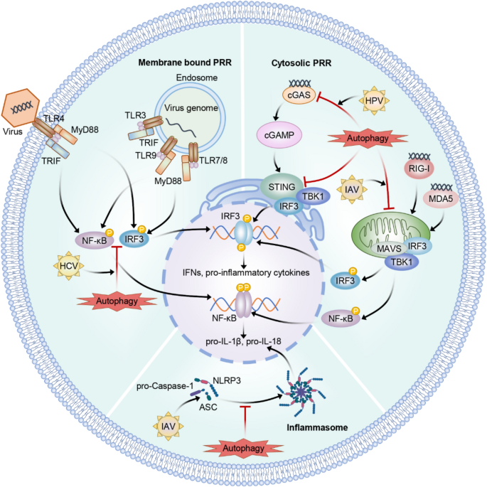 自噬通过降解细胞内多余的成分,在维持细胞代谢稳态方面发挥着重要作用。此外,它还是宿主清除入侵病原体(如病毒)的防御机制。病毒感染的发生会触发自噬,从而通过模式识别受体途径启动先天免疫反应。因此,会生成干扰素和其他促炎因子。此外,自噬会特异性地降解与病毒颗粒相关的免疫成分。通过向T淋巴细胞呈递病毒衍生的抗原,这一过程有助于适应性免疫的形成。然而,某些病毒会进化出抑制自噬的机制,从而逃避降解和免疫检测,因为自噬与多种炎症性疾病密切相关,包括感染、自身免疫性疾病、癌症、代谢综合征、神经退行性疾病以及心血管和肝脏疾病。本文旨在总结目前关于在病毒感染过程中参与模式识别受体信号传导的关键分子和具体分子机制的知识。