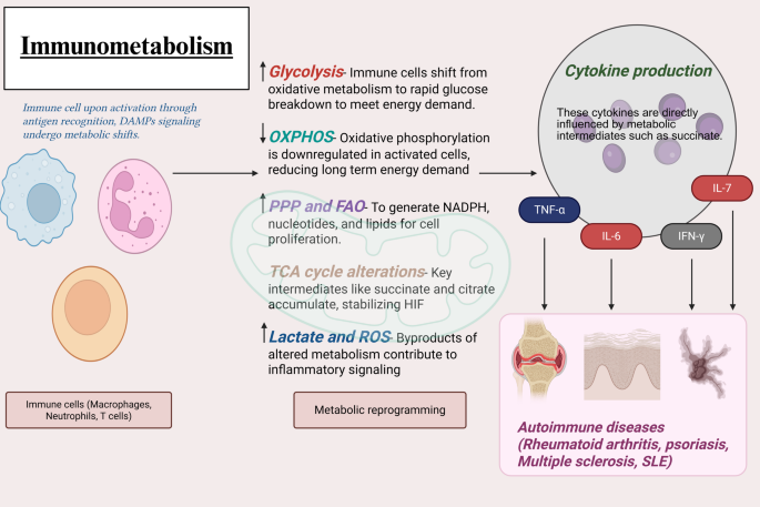 在自身免疫性疾病和慢性炎症综合征中,免疫系统会攻击自身的组织,导致渐进性的组织损伤和器官功能障碍。银屑病、多发性硬化症、类风湿性关节炎和系统性红斑狼疮等疾病的发生与促炎细胞因子(如肿瘤坏死因子α(TNF-α)、白细胞介素6(IL-6)和白细胞介素17(IL-17)的过度产生以及异常的免疫激活密切相关。免疫代谢学研究的是代谢途径如何调控免疫细胞的活动,这与自身免疫密切相关。免疫细胞激活过程中发生的代谢重编程会使T细胞、B细胞和巨噬细胞从氧化磷酸化转变为糖酵解或谷氨酰胺分解代谢,从而促进细胞因子的释放和快速增殖。除了维持炎症反应外,这种代谢转变还会调节效应细胞与调节细胞之间的平衡,进而加剧自身免疫反应。自身免疫性疾病所特征的慢性炎症正是由于这种改变的代谢状态下细胞因子的过度产生所致。本文通过强调免疫细胞中代谢重编程的重要性及其在调节细胞因子生成中的作用,为自身免疫的病理生理学提供了新的见解。对代谢途径的全面了解将有助于发现新的治疗方法,以调节异常的细胞因子并恢复免疫平衡。