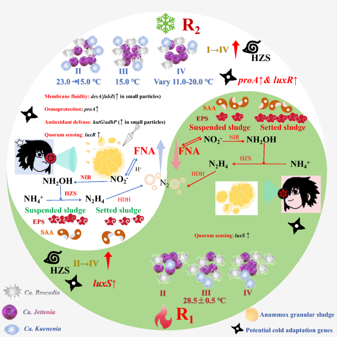 厌氧氨氧化(anammox)是一种可持续且能源效率高的废水处理技术,适用于高氨浓度和低碳氮比(C/N比)的废水。然而,其运行性能常受到低温的挑战,尤其是在实际应用中常见的温度波动条件下。了解anammox颗粒污泥对这种温度压力的适应机制对于该技术的稳定应用至关重要,特别是涉及污泥大小、微生物群落动态以及与氮去除和耐寒性相关的功能基因之间的相互作用。本研究通过观察两个不同温度条件下的anammox反应器(一个在高温28.3°C下运行,R1;另一个在波动的低温11–23°C下运行,R2)来阐明这些机制。结果表明,在低温下,游离亚硝酸盐(FNA)水平的升高(>0.5 μg L?1)与anammox活性受到抑制有很强的相关性;在15°C时,氮去除效率比高温反应器R1降低了16%。表观温度系数(Q10)介于0.90到1.27之间,表明细菌活性具有典型的温度依赖性。低温增加了胞外聚合物物质(EPS)的结构脆弱性,削弱了颗粒的强度,并使小颗粒(<0.25 mm)的比例相对于R1增加了32%,同时使生物量含量(挥发性悬浮固体(VSS)/悬浮固体(SS)降至27.9%。我们的研究发现,该系统并非简单地受到抑制,而是表现出复杂的适应反应:较大的颗粒(>2 mm)作为核心anammox细菌(尤其是Candidatus Jettenia caeni)的稳定储存库,确保了生物量的保留;而通过低温诱导碎裂产生的较小颗粒(<0.25 mm)则充当了先锋角色。这些小颗粒富含一系列适应低温的基因,使它们能够通过调节膜流动性、合成适应性溶质、增强抗氧化防御以及精细调节细胞间通信来直接应对低温压力,从而表现出更高的环境敏感性。