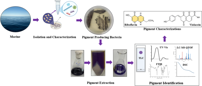 合成染料在纺织和食品工业中被广泛使用,但它们对环境和健康构成了显著风险。因此,人们对可持续、无毒且可生物降解的天然色素的兴趣日益增加。由细菌、酵母和藻类合成的微生物色素(即生物活性化合物)因其快速的生产能力、能够在低成本底物上生长以及对环境条件的抵抗力,成为天然色素来源的强大替代品。在这项研究中,研究人员调查了从马尔马拉海分离出的细菌的色素生产潜力,并在适宜的生长条件下生产了这些色素以进行进一步表征。通过16S rRNA基因序列分析在分子水平上鉴定了这些分离株。在总共11个产色素的细菌分离株中,有4个分离株(编号为15、42、61和63)在培养基中表现出强烈的色素生成能力,被选为详细分析的对象。这些分离株分别被鉴定为:Pseudoalteromonas ulvae、Salinicoccus roseus、Exiguobacterium acetylicum、Tenacibaculum lutimaris、Shewanella oneidensis、Zobellia galactanivorans和Maribacter dokdonensis。使用95%甲醇从这些菌株中提取了色素,并通过以下方法对其进行了表征:薄层色谱法(TLC)、紫外-可见光谱法(UV-Vis)、傅里叶变换红外光谱法(FTIR)、差示扫描量热法(DSC)以及液相色谱-四极杆飞行时间质谱法(LC-QTOF-MS)。在这些分离株中,Pseudoalteromonas ulvae产生了紫色 violacein 色素,而 Zobellia galactanivorans 和 Tenacibaculum lutimari 则产生了核黄素色素。