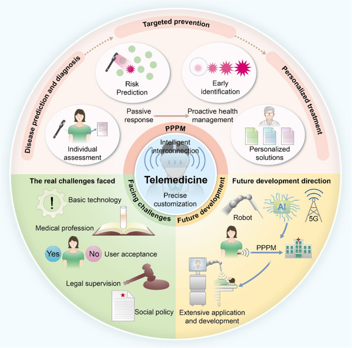 远程医疗是一种以患者为中心的创新医疗保健服务模式,它利用先进的通信技术传输医疗数据和服务,无缝整合了医生、患者和医疗协调者的角色。通过优化医患互动流程,远程医疗不仅消除了地理障碍,提高了医疗服务的可及性,还促进了预测性医疗、预防性医疗和个性化医疗(PPPM)的实际应用。一个开放的、分布式的远程医疗系统包括远程诊断、专家咨询、信息服务、在线检查和远程学习等功能,为将医疗模式从被动治疗转变为主动健康管理奠定了基础。本文回顾了远程医疗在PPPM框架下的现状和未来发展方向,详细介绍了预测性诊断、预防性策略和个性化治疗方法的最新进展。特别是,文章强调了远程医疗在优化医疗资源配置以及提高服务质量和效率方面的作用——指出医疗从业者可以利用动态收集的远程数据及时评估患者状况,从而减少后续就诊延迟并实现比传统方法更早的诊断。此外,文章还分析了远程医疗面临的关键挑战,如技术限制、医疗专业要求、用户接受度、法律和监管空白、政策限制、运营管理难题以及报销问题,并提出了推动其更广泛应用的针对性策略。展望未来,在PPPM理念的指导下,借助机器人技术、5G、物联网(IoT)和人工智能等新兴技术,远程医疗将更好地与传统医疗体系融合,为智能、预测性和个性化医疗服务模型的发展铺平道路。这些技术将加速PPPM的理论研究和临床应用,从而推动全球医疗体系的高质量发展。
