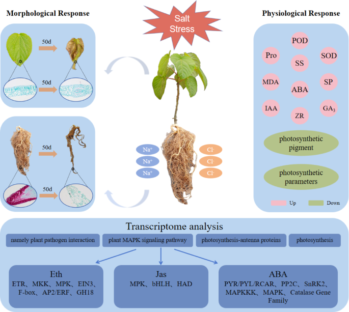 I. polycarpa ‘Yuji’对盐胁迫的综合作应机制。在盐胁迫下,I. polycarpa ‘Yuji’的叶片和根部表现出明显的形态变化,同时关键生理和生化指标也发生了改变。转录组分析显示广泛的转录重编程,尤其是与激素信号传导(尤其是MAPK级联)和应激响应通路相关的基因家族发生了显著调控,这些共同构成了该物种的耐盐适应性机制。