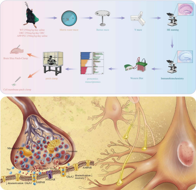 对APP/PS1转基因小鼠的行为测试表明,ORC显著改善了认知功能。HE染色和免疫组化结果显示,ORC减少了小鼠海马CA1区域的神经退化。与野生型(WT)对照组相比,APP/PS1小鼠海马中的NeuN、GAP43、MAP2和Syn蛋白浓度显著降低,而ORC干预逆转了这一下降趋势。蛋白质组学和转录组学分析表明,ORC可能调节谷氨酸受体通路。电生理学研究发现,ORC显著增强了海马神经元的反应性,并增加了sEPSCs、AMPAR依赖的eEPSCs和mEPSCs的频率和幅度。动力学研究表明,ORC减缓了AMPAR的GluA1和GluA2亚单位的脱敏速率,对其失活没有显著影响,并促进了GluA2亚单位脱敏受体的恢复,而对GluA1没有影响。