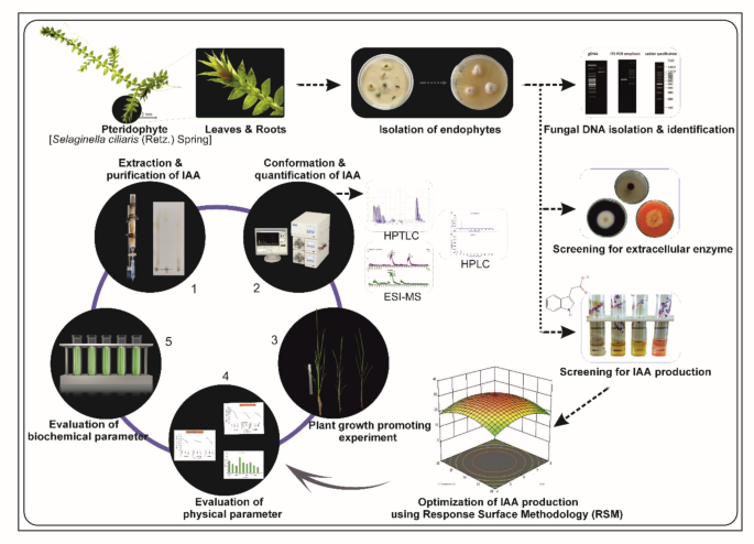 与宿主植物形成共生关系的内生真菌被认为能够促进植物生长,并减轻非生物和生物因素带来的不利影响。然而,由于对促进植物生长的微生物以及蕨类植物的了解有限,本研究的目的是鉴定和表征来自 (Retz.) Spring的真菌内生菌。通过18S rDNA测序,分离并鉴定了内生真菌 SELC2。该菌株表现出磷酸盐溶解能力、氨生成能力和胞外酶产生能力,并且无论是否存在L-色氨酸,都能生成吲哚乙酸(IAA)。本研究利用中心复合设计(CCD)和响应面方法(RSM)探讨了影响IAA产生的多种环境和营养因素的优化方案。实验结果表明,34℃的培养温度、pH 6.5、6天的培养时间、0.35 g/L的色氨酸浓度以及30 g/L的蔗糖浓度是实现最高IAA产量的理想条件。通过HPTLC和HPLC分析精制后的IAA,结果显示其具有Rf值为0.92的粉红色条带,且在2.5分钟处出现峰值,与标准IAA一致。此外,通过三种水稻品种评估了这种内生菌对 L.初始生长参数的影响,证实SELC2是一种能够显著促进水稻植株生长的菌株;在两种真菌提取物处理方式以及共接种条件下,水稻的光合色素、糖分、蛋白质和抗氧化酶均发生了显著变化。