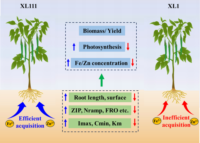 概念模型展示了在高和低铁/锌浓度条件下种植的两种辣椒品种XL111和XL1的根系形态、铁和锌吸收能力、相关基因的表达情况以及光合能力的差异。蓝色和红色箭头分别表示相应指标的高效和低效水平。
