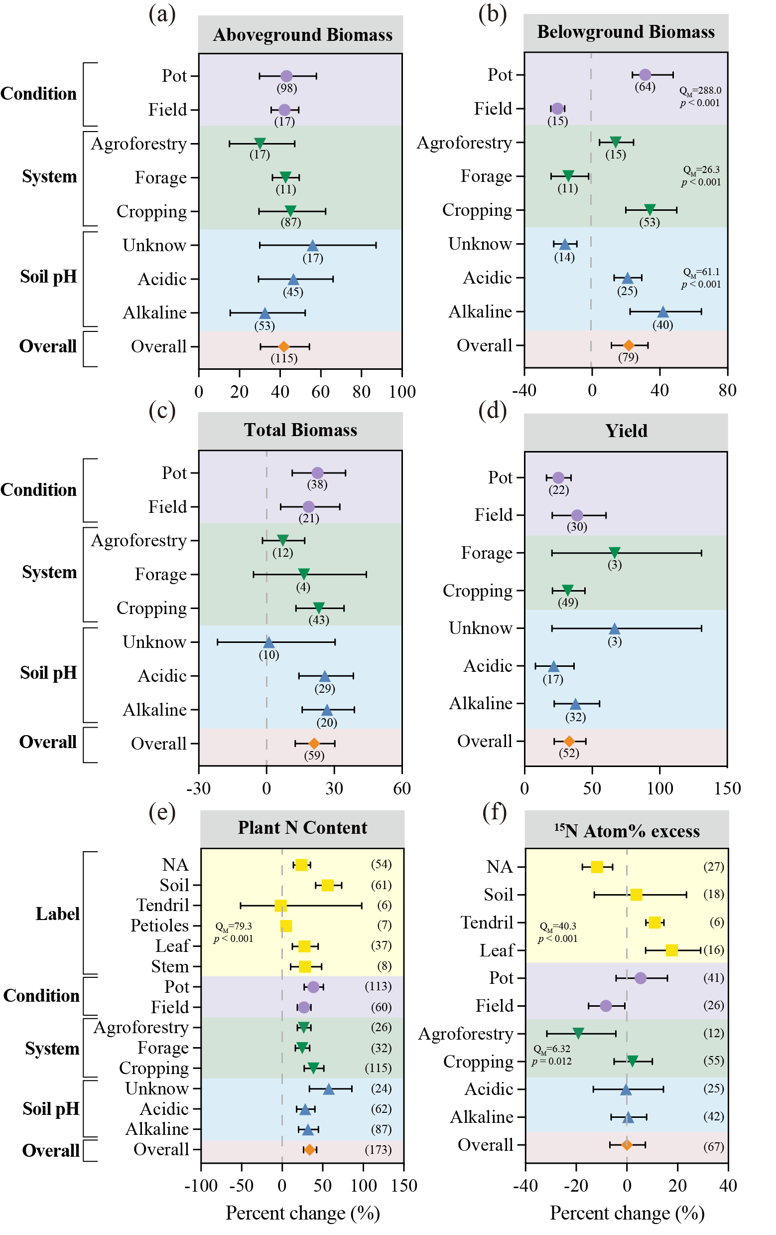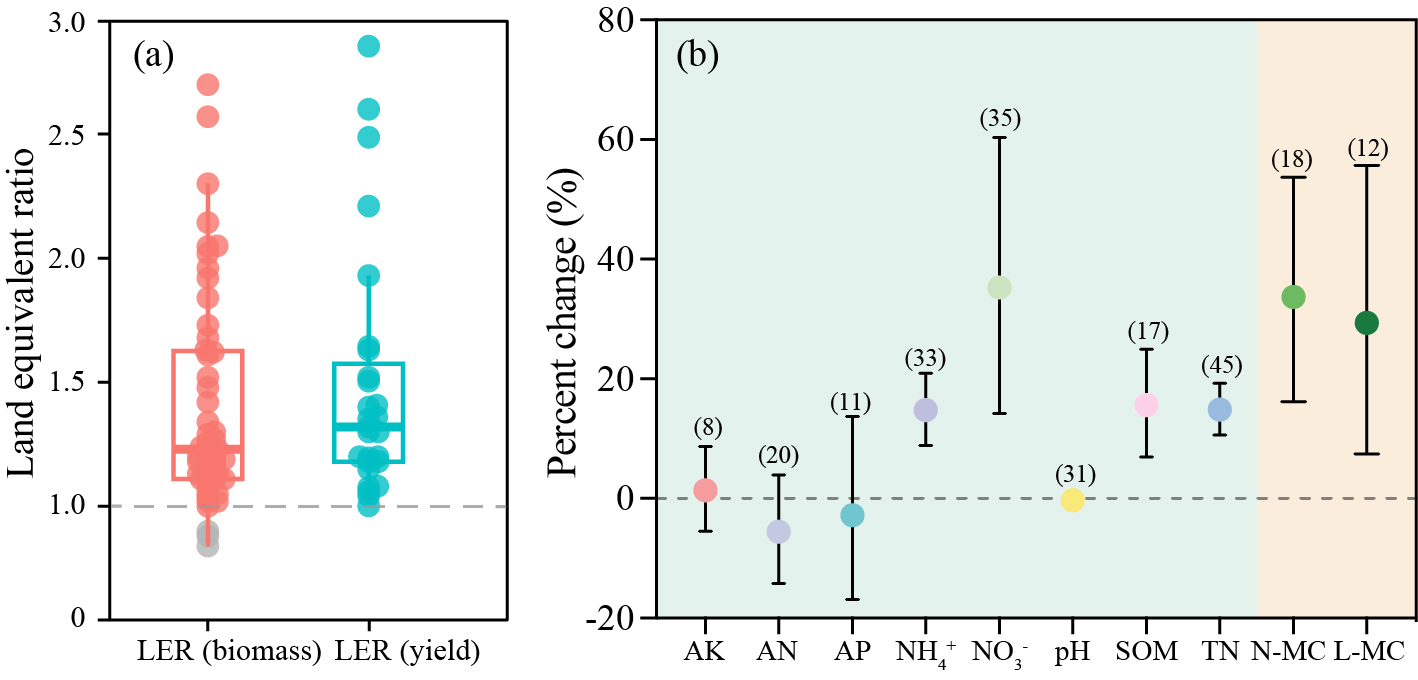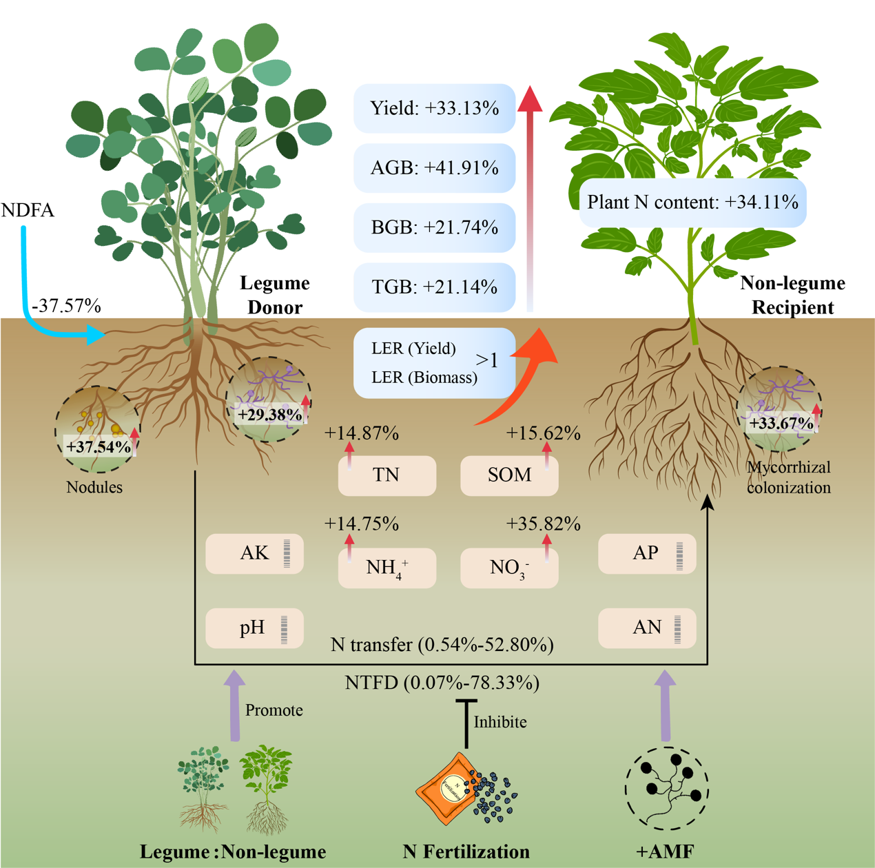 如今,全球农业面临着双重挑战:人口增长引发更大的粮食需求,和化肥过量施用导致的环境退化。引入具有共生固氮能力的豆科作物进行间作,被视为一种减少化肥依赖、提升土壤氮素有效性的可持续策略。然而,驱动这些生态优势的氮素动态机制,尤其是豆科所固定的氮向邻近非豆科作物进行种间转移的过程,在全球尺度上仍缺乏系统性量化。基于此,中国科学院成都生物研究所抗逆植物适应与筛选研究团队整合了全球74项研究,采用Meta分析方法,深入解析了豆科作物促进间作体系中非豆科作物生长的内在机制。