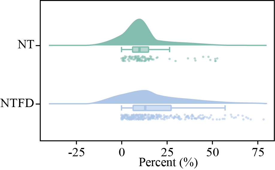 研究表明:(1) 与豆科作物间作后,土地当量比普遍>1;非豆科作物的生物量、产量及氮含量均显著提高 (图1);(2) 与豆科间作促进非豆科作物生长,得益于土壤硝态氮、铵态氮、全氮和有机质含量的显著提升,以及根系丛枝菌根真菌(AMF)定殖率的显著增加 (图2);(3) 种间氮转移是促进非豆科作物生长的另一关键机制,豆科作物向邻体植物的氮转移比例为0.54%~52.8%,非豆科作物通过转移获得的氮占其总氮量的比例为0.07%~78.33% (图3);(4) 氮转移量受植物组合、微生物群落、土壤性质及管理措施等多种因素影响。其在田间试验条件及牧草系统中最高;采用自然丰度法测得的转移量显著高于土壤或植物标记法 (图4); (5) 在人工管理措施中,提高豆科作物种植比例及接种AMF可显著促进氮转移,而施用氮肥则表现出抑制作用 (图5)。这些研究结果可为设计兼顾粮食安全与环境可持续性的低投入农业系统提供坚实的科学依据。