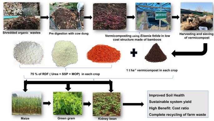 这项长期研究调查了在印度阿萨姆邦的雨养Inceptisol土壤上,采用综合养分管理(INM)技术于玉米-绿豆-肾豆种植系统中对作物产量可持续性和土壤健康的影响,旨在确定有机肥料与化学肥料的最佳组合,以实现可持续的生产力、土壤健康和经济可行性。实验在2015年至2023年间于阿萨姆邦的北岸平原地区进行,采用随机区组设计,在沙质壤土中设置了11种处理方式,每种处理重复三次。处理方式包括:施用推荐剂量的50%或75%化肥(RDF)并添加蚯蚓堆肥(1或3吨/公顷)或Sesbania aculeata绿肥(50公斤/公顷)于玉米种植中;仅施用有机肥料;以及不施用任何肥料作为对照。研究评估了系统产量、雨水利用效率(RWUE)、可持续产量指数(SYI)、效益成本比(B:C)以及土壤性质。结果表明,处理组合75% RDF + 3吨/公顷蚯蚓堆肥(T?)获得了最高的系统产量(14.1吨/公顷)、雨水利用效率(8.90公斤/毫米降雨量)和可持续产量指数(0.82)。然而,最具经济可行性的处理方式是每种植物分别施用75% RDF + 1吨/公顷蚯蚓堆肥(T4),其系统产量为12.5吨/公顷,效益成本比为2.33。与100% RDF和对照组相比,结合使用化学肥料和蚯蚓堆肥的处理在系统产量和土壤健康方面表现更优。对比分析证实,基于蚯蚓堆肥的处理方式在维持较高系统产量方面比绿肥更有效。每种植物施用75%推荐剂量的化肥和1吨/公顷蚯蚓堆肥的处理方式,在雨养玉米-绿豆-肾豆种植系统中实现了可持续产量、土壤健康和经济可行性的最佳平衡。