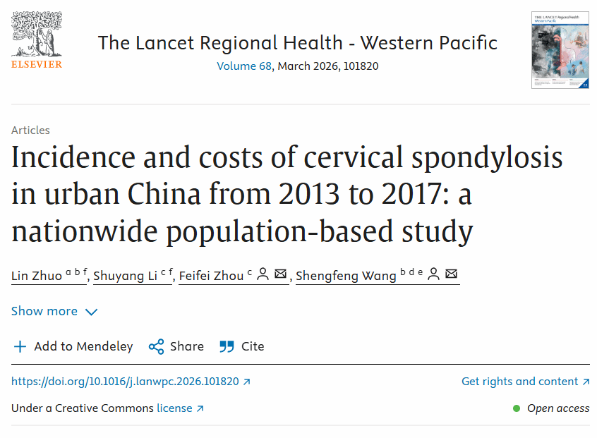 2026年2月25日,北京大学第三医院骨科周非非教授团队联合北京大学公共卫生学院王胜锋研究员团队,在国际权威医学期刊、《柳叶刀》子刊《柳叶刀区域健康-西太平洋》(The Lancet Regional Health-Western Pacific)上在线发表了题为《2013年至2017年中国城镇地区颈椎病的发病率与医疗费用分析:一项基于全国人口的研究》(“Incidence and costs of cervical spondylosis in urban China from 2013 to 2017: a nationwide population-based study”)的研究成果。