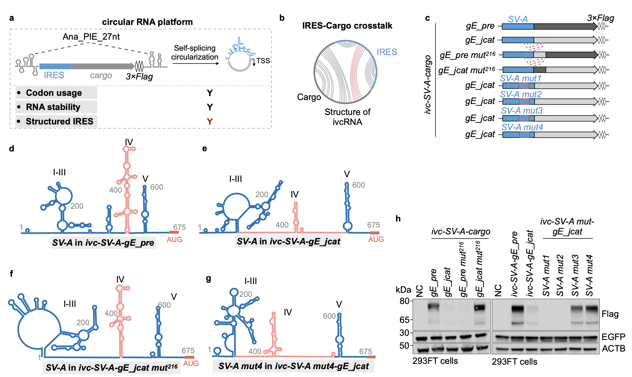 环形RNA是一类共价闭合的单链RNA,相比线性RNA更稳定、免疫原性更低,具备特殊的空间构象。体外工程化环形RNA (in vitro circularized RNAs, ivcRNAs),正在发展为极具潜力的新型RNA药物平台。近年来研究主要围绕两大方向:一是开发为RNA适配体,用于调控靶蛋白;二是用作蛋白质翻译载体,实现长效蛋白表达。作为表达载体,工程化环形RNA的翻译通常依赖病毒来源的内部核糖体进入位点(internal ribosome entry site, IRES)启动,但是在工程化环形RNA中IRES结构是否受编码序列(cargo)影响未知。