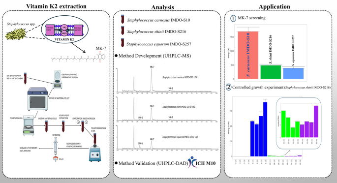 本研究优化了葡萄球菌提取维生素K2的方法,开发了10分钟快速UHPLC-DAD检测法,发现IMDO-S10菌株产MK-7最高(1688 nmol/g),而IMDO-S216在高氧下产量下降,该方法支持食品发酵应用|