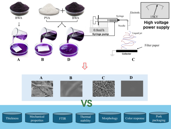 本研究以纸张为基材,利用黑枸杞(Lycium ruthenicum)中的花青素作为显色剂,通过浸渍、浇铸和静电纺丝方法制备了基于纸张的显色指示剂。对这些指示剂进行了pH敏感性评估,并将其应用于5°C下的空气包装(AP)和改良气氛包装(MAP)条件下监测猪肉的新鲜度,以确定最佳的智能显色纸张。在四种指示剂(A、B、C和D)中,通过浸渍法制备的花青素-PVA/纸张指示剂(指示剂B)在临界pH范围6–8内表现出最明显且稳定的颜色变化(ΔE?>?5,在30分钟内),同时保持了良好的结构完整性。傅里叶变换红外光谱(FTIR)、热重分析(DTG)和扫描电子显微镜(SEM)分析证实了其均匀且稳定的结构。在应用测试中,采用AP包装的猪肉在第3天时微生物含量超过了可接受限值(TVC?>?6 log CFU/g)和TVB-N阈值(15 mg/100 g),而MAP包装有效延缓了这些变化。指示剂B的颜色变化与TVC、TVB-N和pH值的变化密切相关,能够在AP条件下清晰地显示变质迹象,并在MAP条件下保持良好的可接受性。总体而言,指示剂B被确定为一种实用且可靠的冷藏猪肉新鲜度智能指示剂。
