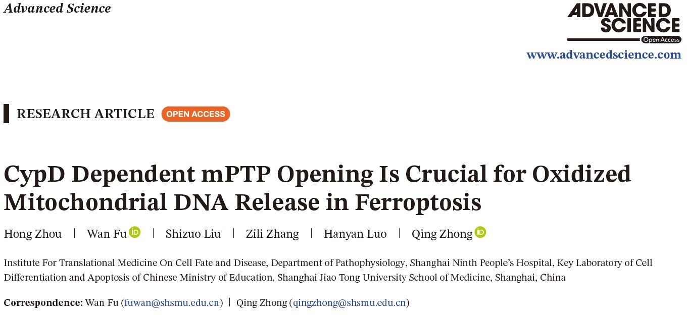 近日,上海交通大学医学院钟清、付婉团队在Advanced Science发表研究成果,首次揭示线粒体在铁死亡中的全新信号转导机制:线粒体渗透性转换孔(mPTP)开放后释放氧化损伤的线粒体DNA(ox-mtDNA),激活cGAS–STING通路并诱导“铁自噬”,从而放大铁死亡反应