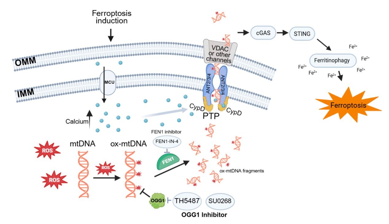 进一步机制研究显示,mPTP开放会将氧化损伤的mtDNA释放至胞质。超分辨成像证实,铁死亡过程中mtDNA从线粒体转移至胞质区域。与此同时,抑制mtDNA修复酶FEN1或OGG1可增加氧化mtDNA的积累,并显著增强细胞对铁死亡诱导剂的敏感性;这一效应依赖mPTP及相关通道蛋白ANT等组分。