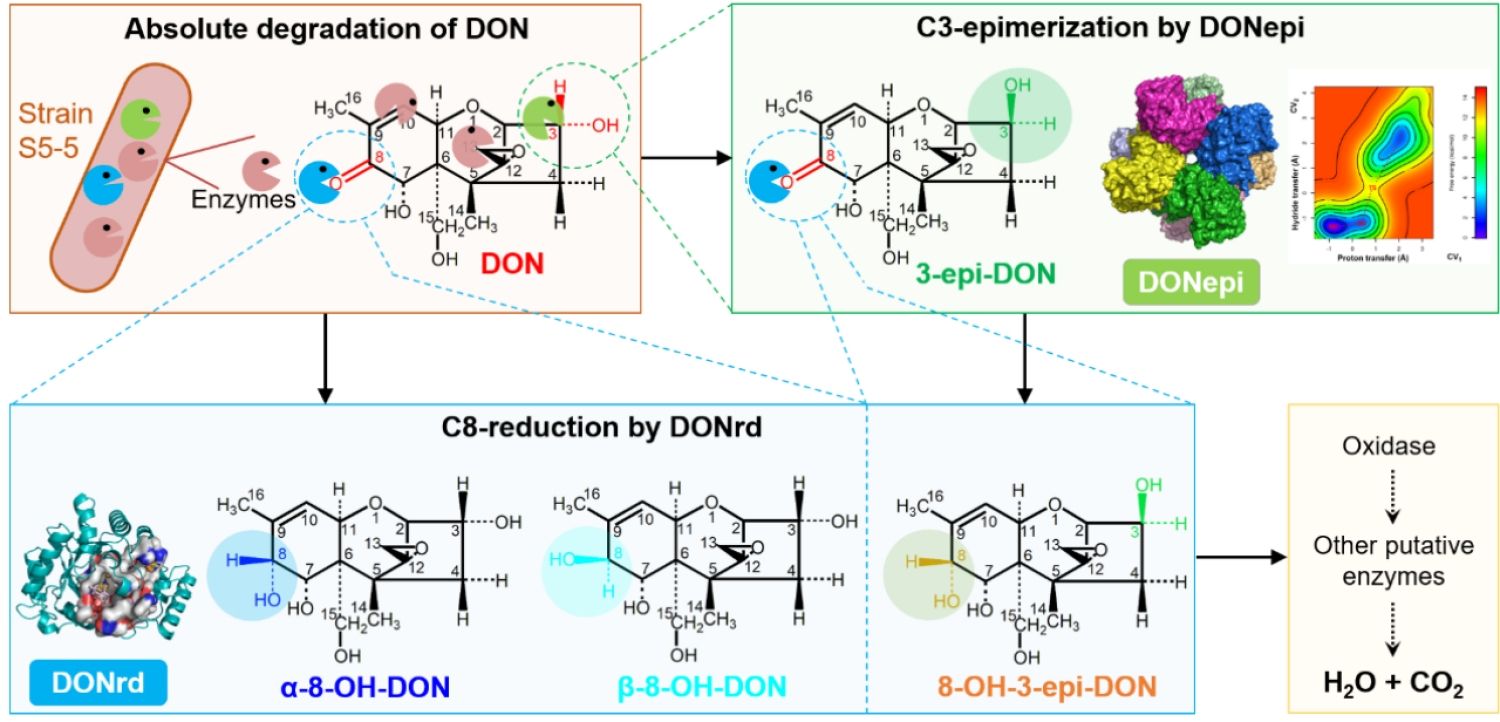 与传统的DON异构化由两种酶经过两步反应催化完成不同,DONepi可单独催化DON的C3异构化,研究团队利用冷冻电镜(Cryo-EM)技术对其蛋白结构进行了解析,发现其形成独特的八聚体结构,由两个呈30°偏移的同源四聚体通过C端尾环相互锚定形成,每个单体包含典型的AKR家族(α/β)8桶状结构域与NADP?结合位点。结合量子力学/分子力学元动力学(QM/MM-MD)等多维度模拟分析,团队发现DONepi催化DON异构化时,首先形成一个瞬时的酮基中间产物,随后,DONepi驱使该中间体在活性口袋内发生刚性旋转,通过NADPH介导的立体选择性还原生成3-epi-DON。这一“瞬时酮基中间产物”机制,为AKR家族的功能多样化提供了新认知。而DONrd负责催化一种新的DON降解方式-C8酮基的还原。通过 AlphaFold2 结构预测与分子对接分析,发现DONrd同样具有(α/β)8桶状结构,但C端尾环与DONepi存在明显差异,DON以不同的手性方向进入其催化活性口袋,会形成一对差向异构体:α-8-OH-DON和β-8-OH-DON,这是首次在DON降解中发现这种催化反应。这些中间代谢物还会在其他多个酶(如细胞色素P450酶等)的作用下进一步被降解,最终实现DON的完全降解。