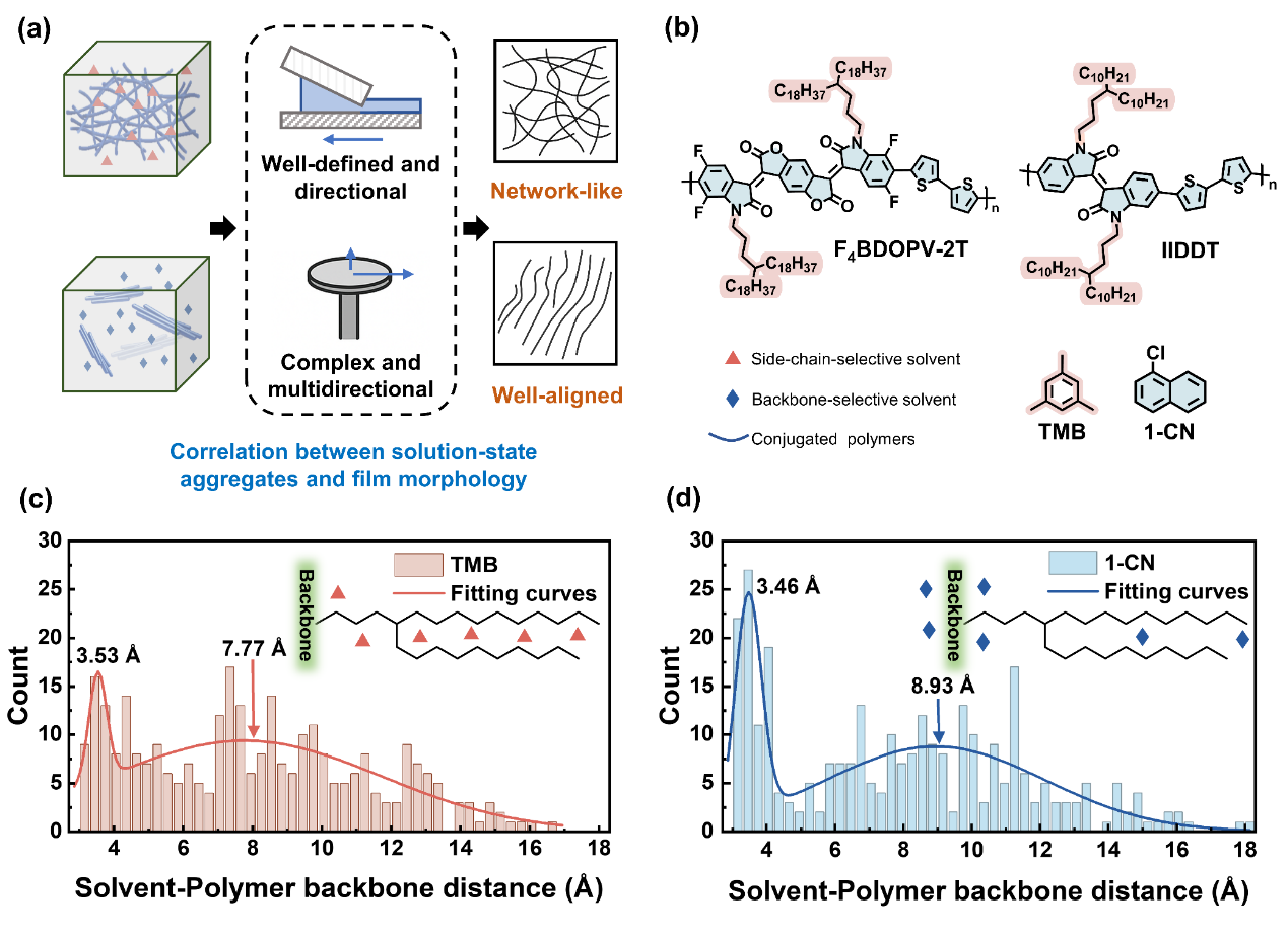 图1 溶液态聚集调控共轭高分子链取向。(a)示意图展示了F4BDOPV-2T在不同溶剂及加工方式下,溶液聚集结构与薄膜形貌之间的关系。(b)F4BDOPV-2T、IIDDT、TMB和1-CN的化学结构。(c、d)分别为F4BDOPV-2T在TMB和1-CN溶液中,溶剂分子与共轭主链距离分布的统计结果