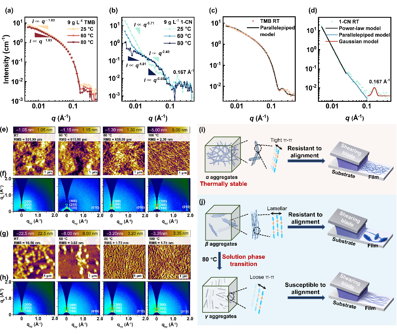 (2)在主链选择性溶剂1-CN中,烷基侧链溶解性较低,使体系形成以侧链相互作用为主导的三维聚集体。这些聚集体在溶液剪切过程中会被保留到固态微观结构中。随着温度升高,侧链相互作用被削弱,聚集体逐渐转变为一维棒状聚集体。由于1-CN与共轭主链之间存在较强相互作用,高分子内部的π–π堆积变得更加松散,使其在剪切力作用下更容易发生取向。