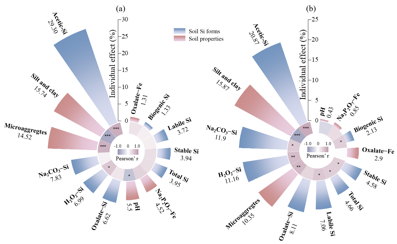 中国科学院华南植物园生态中心博士研究生余恒等人依托建立的“林冠、林下氮添加模拟大气氮沉降”野外控制实验平台,探讨了不同氮添加方式对土壤硅组分的差异性影响及其机制。结果表明,不同氮添加方式对土壤硅组分的影响不同:林冠氮添加显著提高了土壤氯化钙提取态硅(植物有效硅)、乙酸提取态硅和草酸提取态硅的含量,主要归因于低结晶度成土氧化物的增加,可能为有效硅提供了更多的吸附位点;林下氮添加则通过显著降低土壤 pH 并提高土壤有机碳含量,增强了非晶态/生物源硅组分(如过氧化氢提取态硅、碳酸钠提取态硅和土壤植硅体)的含量。值得注意的是,植物有效硅仅在深层土壤中与碳酸钠提取态硅和土壤植硅体呈显著正相关,但在表层和审查土壤中与乙酸提取态硅和过氧化氢提取态硅显著正相关。本研究发现,土壤中的植硅体可能并非植物有效硅的唯一来源,吸附/解吸过程也是调控土壤硅有效性的关键机制之一。上述结果揭示了不同氮添加方式对土壤硅组分的差异性机制,在评估大气氮沉降对森林生态系统硅生物地球化学循环影响时,应充分考虑林冠生态过程。