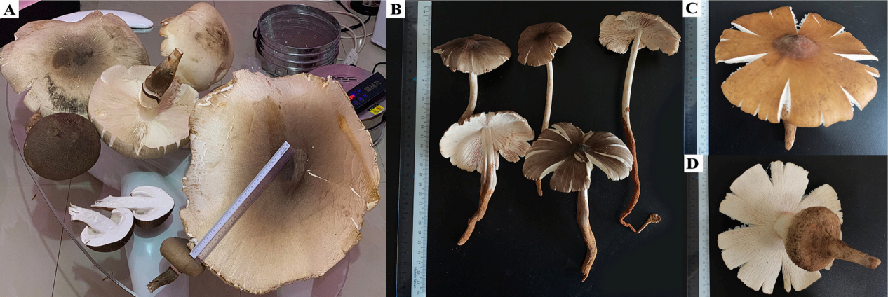 图1?蚁巢伞真菌:(A)?T. titanicus;(B)?T. intermedius;(C-D)?T. bulborhizus