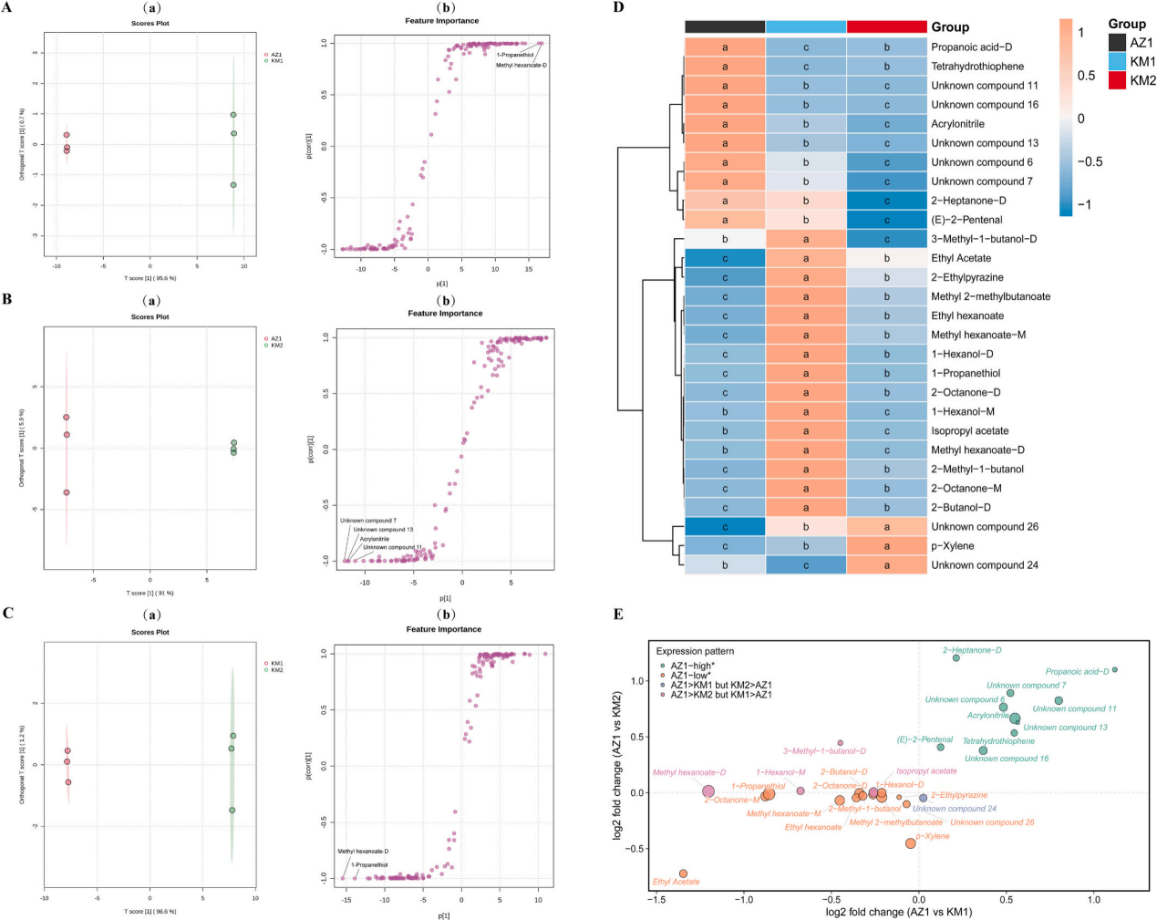 图2?差异挥发性化合物的鉴定与比较(A-D)以及表达模式(E)