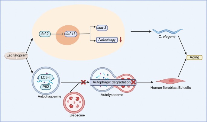 选择性5-羟色胺再摄取抑制剂 Escitalopram 加速衰老,通过抑制胰岛素/IGF-1 信号通路和自噬功能,导致线虫寿命缩短及细胞衰老,机制涉及线粒体功能障碍和自噬体-溶酶体融合受阻。
