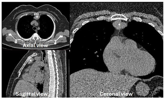 图1. 多平面CT扫描显示,一名49岁非重症肌无力女性患者的左侧胸腺瘤(*)大小为35毫米。