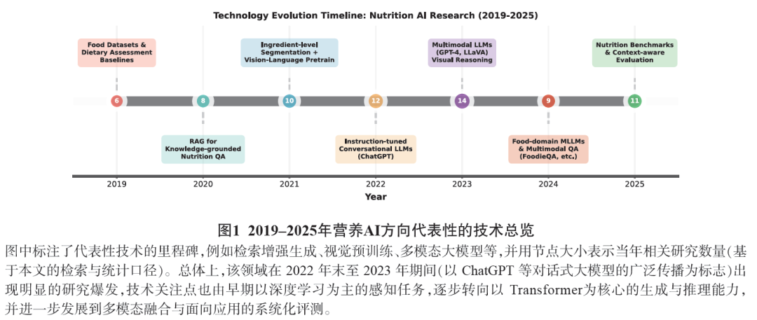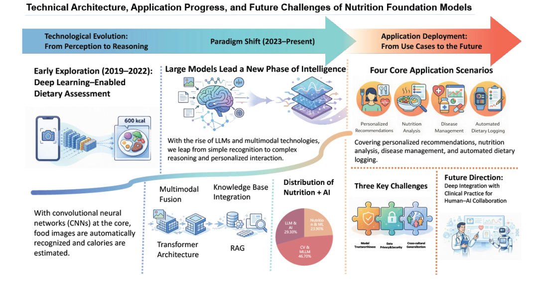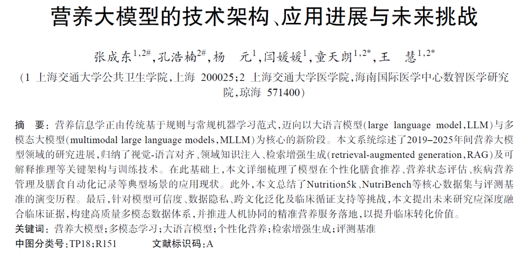 营养信息学正由传统基于规则与常规机器学习范式,迈向以大语言模型(large language model,LLM)与多模态大模型(multimodal large language models,MLLM)为核心的新阶段。近日,上海交通大学公共卫生学院王慧团队在中文核心期刊《食品科学》上发表了题为《营养大模型的技术架构、应用进展与未来挑战》的特约综述。本文系统综述了2019–2025年间营养大模型领域的研究进展,归纳了视觉-语言对齐、领域知识注入、检索增强生成(retrieval-augmented generation,RAG)及可解释推理等关键架构与训练技术。在此基础上,本文详细梳理了模型在个性化膳食推荐、营养状态评估、疾病营养管理及膳食自动化记录等典型场景的应用现状。此外,本文总结了Nutrition5k、NutriBench等核心数据集与评测基准的演变历程。最后,针对模型可信度、数据隐私、跨文化泛化及临床循证支持等挑战,本文提出未来研究应深度融合临床证据,构建高质量多模态数据体系,并推进人机协同的精准营养服务落地,以提升临床转化价值。