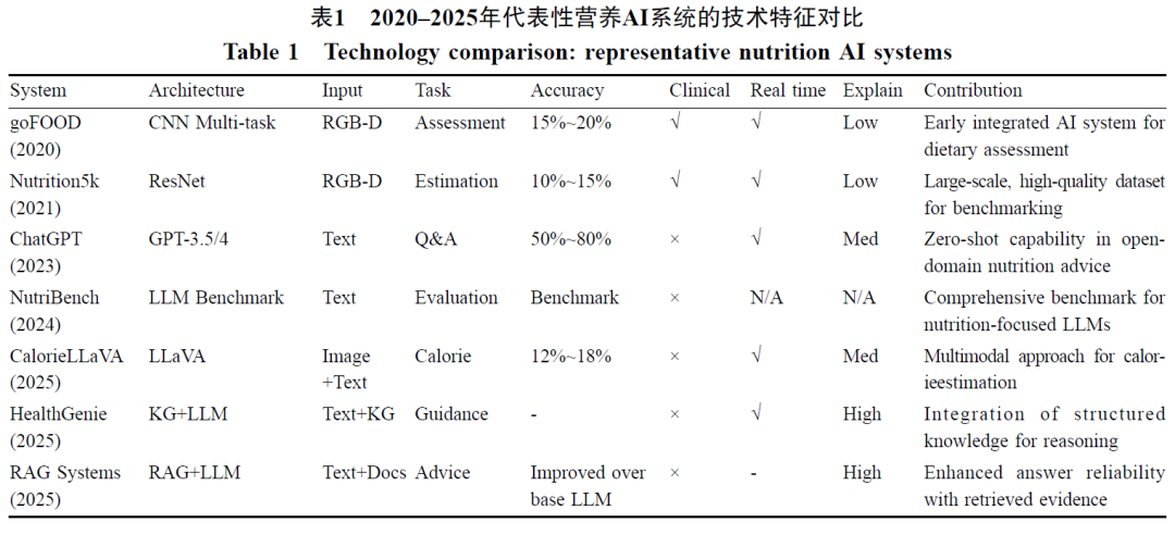 表1对比了2020–2025年间具有代表性的营养AI系统及其核心特征,并展示了早期以计算机视觉为主的膳食评估模型(goFOOD?、Nutrition5k),以及近期融合LLM、多模态、知识图谱的新型系统(CalorieLLaVA、HealthGenie、RAG-based等)。从中可以看出,不同系统在架构类型、输入模态、主要功能任务等方面各具特色。从表1的对比中还可以发现几个值得关注的共性趋势:其一,目前多数系统尚缺乏严格的临床验证,列举的7个系统更多停留在离线实验、用户研究或技术验证阶段;其二,实时性和多模态能力在新近系统中已成为标配,说明营养AI应用正朝着即时交互和数据多源融合方向发展;其三,可解释性和知识融合逐渐受到重视,2025年的几个系统通过引入知识图谱、RAG等方式提高了模型决策的透明度和可信度。