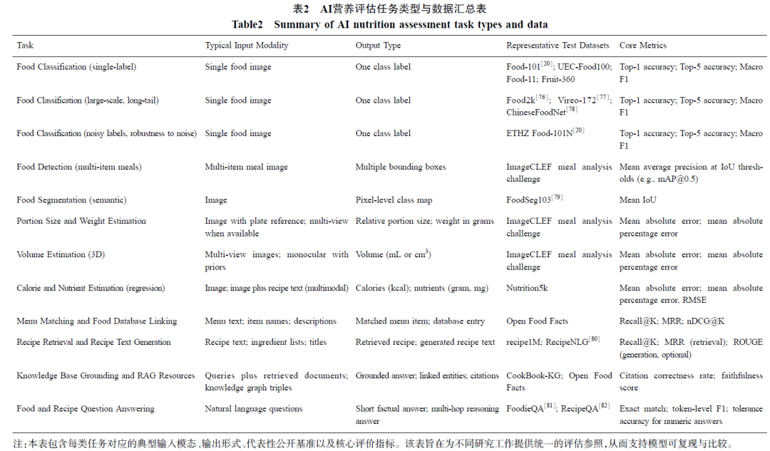 对于营养AI模型的性能评估,需要针对不同任务采用相应指标和基准。对于食物分类任务,常用指标为Top-1准确率、Top-5准确率等;对于营养成分回归任务,则采用均方误差(MSE)、平均绝对百分比误差(MAPE)等衡量模型对热量、营养素的预测精度;在膳食模式分析中,则可能使用饮食质量评分(如Healthy Eating Index)或与健康结局的相关性作为评价标准(表2)。不同模型各有所长,目前尚不存在“通吃”所有营养任务的单一模型。这也正是本领域有趣和复杂之处:研究者需要针对具体问题选择或打造最合适的模型,并不断以数据为驱动进行改进迭代。