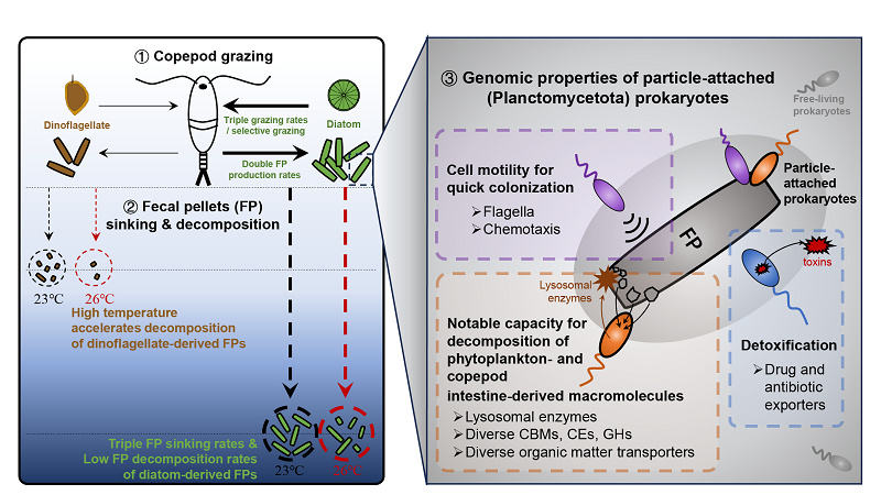 此外,研究还发现升温会通过增强关键分解酶基因丰度显著加快 FP 分解,且对甲藻来源 FP 的加速效应更为突出。全球变暖背景下,许多海域持续出现硅藻比例下降、甲藻比例上升的结构性转变,这意味着这些区域的POC会更快被再矿化并滞留在上层海洋。研究结果强调,在评估碳汇功能变化时,需要将浮游植物组成、浮游动物摄食与微生物动力学过程作为一个耦合系统综合考虑,才能更准确刻画 BCP 的响应与不确定性来源。