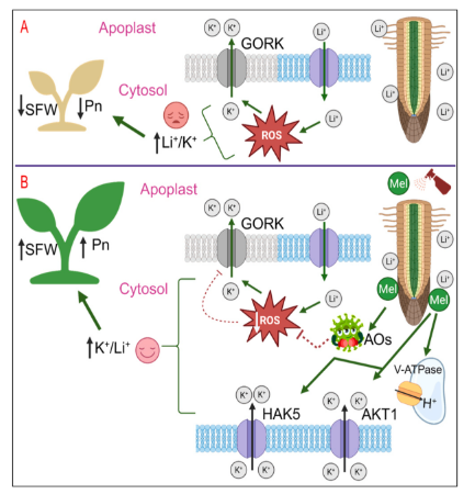 图:锂胁迫影响地上部生长过程中,有无褪黑素参与的根系离子稳态调节机制模型