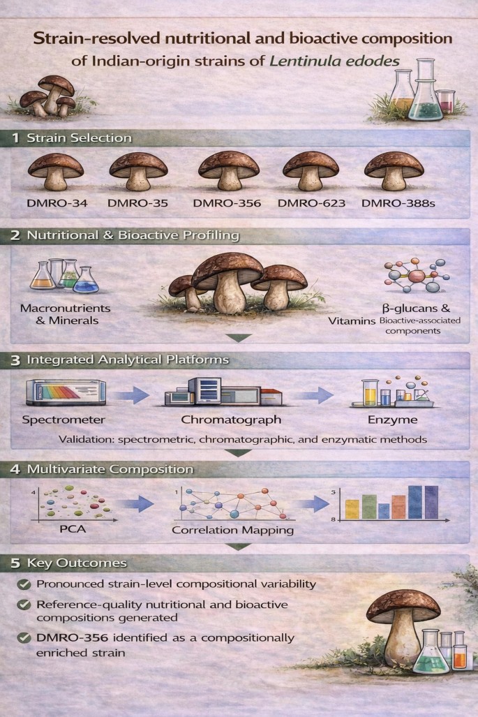 可靠的食品成分数据需要使用经过分析标准化的方法进行菌株特异性的测量;然而,尽管印度来源的Lentinula edodes菌株在商业栽培和食品应用中的重要性日益增加,但相关的参考数据仍然有限。在这项研究中,使用专为食品成分评估定制的综合分析框架,系统地对五种具有商业价值的印度来源L. edodes菌株(DMRO-34、DMRO-35、DMRO-356、DMRO-623和DMRO-388)进行了表征。通过经过验证的光谱、色谱和酶法技术,定量分析了近似成分、矿物质元素、水溶性和脂溶性维生素、氨基酸谱、β-葡聚糖以及选定的生物活性相关和代谢相关指标(总酚类、总黄酮类和游离氨基酸),以确保分析的可比性和重现性。在所有成分维度上均观察到了具有统计学意义的菌株间差异(p < 0.05)。蛋白质(干重占比20.5–32.7%)、β-葡聚糖(干重占比15.4–30.4%)、总酚类(干重每克1.02–2.31毫克没食子酸当量)和游离氨基酸(干重每克0.094–0.147毫克)表现出最大的动态变化范围。多变量分析明确了菌株间的差异,并揭示了营养特性和生物活性相关特征之间的协调变化。在评估的数据集中,DMRO-356菌株在多个成分参数上表现出相对较高的数值,包括蛋白质质量指数、必需矿物质、β-葡聚糖和酚类-黄酮类含量。与已发表的数据集相比,印度来源菌株的成分范围处于全球栽培L. edodes菌株报告的数值范围内,在某些情况下甚至接近其上限。总体而言,本研究为印度来源的L. edodes菌株提供了基于菌株特异性的、分析上可靠的成分参考数据,有助于改进食品成分的表征、菌株区分以及基于营养信息的评估。