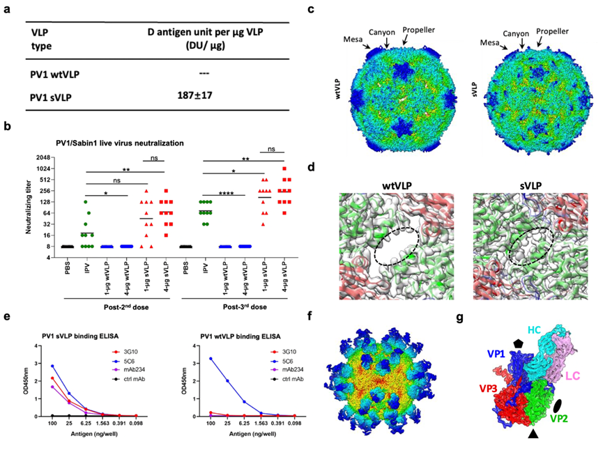 (a)wtVLP与sVLP的D-抗原含量测量;(b)wtVLP与sVLP的中和抗体诱导能力比较;(c)wtVLP与sVLP的冷冻电镜结构;(d)wtVLP与sVLP的二重轴区域的结构差异,显示sVLP二重轴通道关闭;(e)中和抗体结合实验显示3G10特异性识别sVLP;(f)sVLP-3G10 Fab复合体的冷冻电镜整体结构;(g)sVLP-3G10 Fab复合体的单体结构细节。