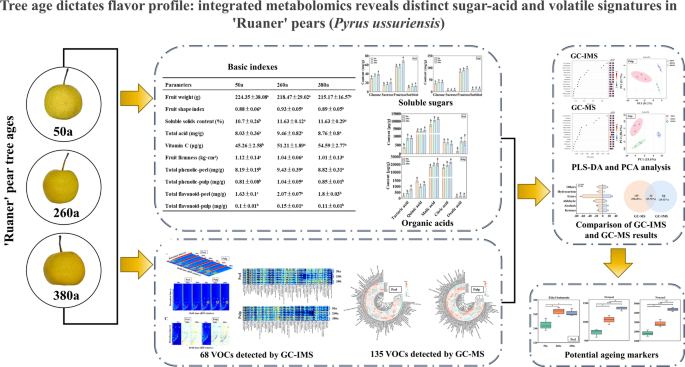 树木的年龄决定了其果实的风味特征:综合代谢组学研究揭示了“阮儿”梨(Pyrus ussuriensis)中独特的糖类-酸类及挥发性化合物组成