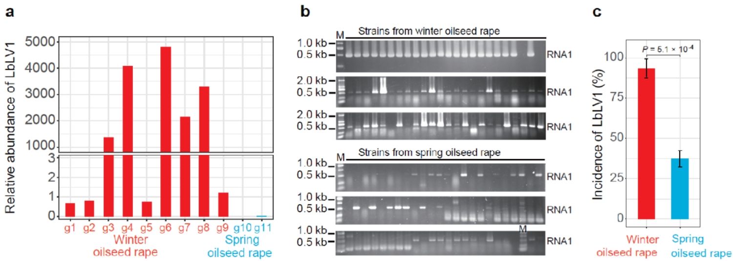 研究团队对来自我国冬油菜区和春油菜区的千余份油菜黑胫病菌菌株进行了病毒组测序分析,发现一种正链RNA病毒(Leptosphaeria biglobosa letobirnavirus 1,LbLV1)在冬油菜区菌株中的携带率高达93.1%,显著高于春油菜区(图1)。冬油菜区夏季高温持续时间较长,病原菌需经历长达四个月的越夏阶段,而春油菜区则不存在高温胁迫的压力。这种分布差异提示LbLV1可能与宿主对高温的适应性相关。