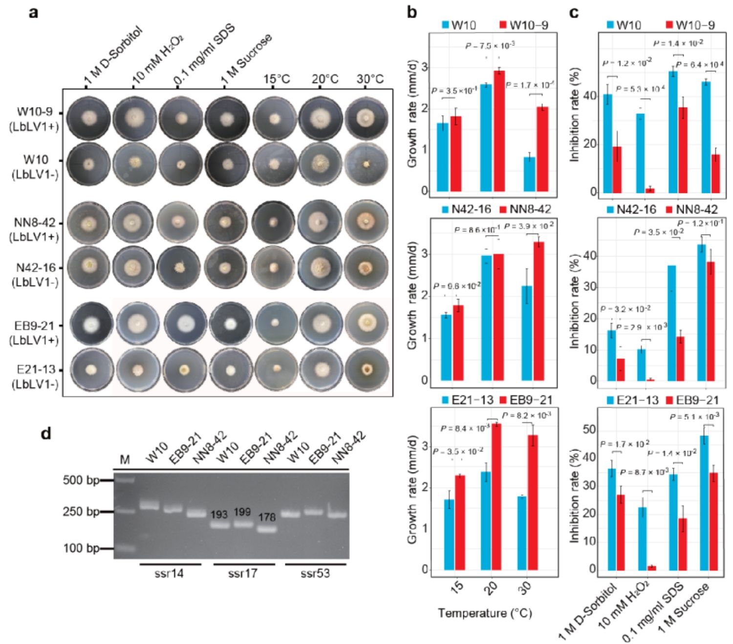 进一步的生物学验证表明,LbLV1能显著提升宿主菌在高温(30℃)、渗透压及氧化胁迫等多种逆境下的生长耐受性(图2)。在模拟越夏的实验室和田间试验中,携带LbLV1的菌株在油菜残秆中的存活率及分生孢子萌发能力均显著高于不携带该病毒的菌株,证明该病毒直接增强了病原菌的越夏生存能力。