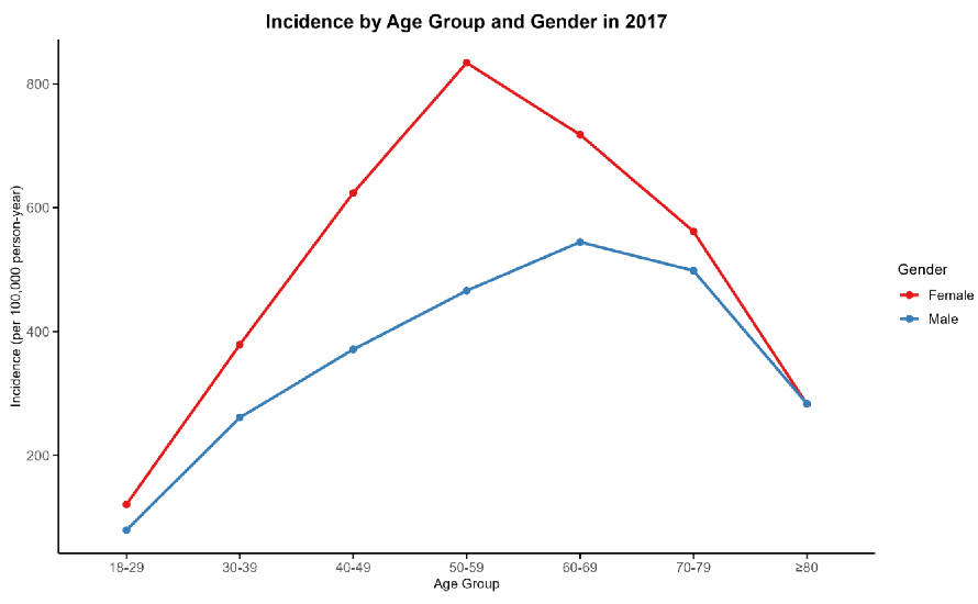 针对上述情况,研究团队首次利用覆盖全国23个省份约3亿城镇居民的医疗保险数据库,全面评估了2013年至2017年间我国城镇成年人群中颈椎病的发病率及经济负担情况,主要得出以下三方面核心发现: