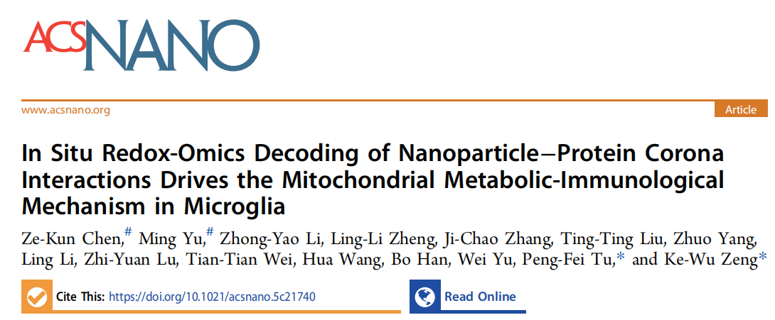 近日,天然药物及仿生药物全国重点实验室曾克武与屠鹏飞团队在国际学术期刊《ACS Nano》上发表了题为“In Situ Redox-Omics Decoding of Nanoparticle-Protein Corona Interactions Drives the Mitochondrial Metabolic-Immunological Mechanism in Microglia”(原位氧化还原组学解码纳米颗粒-蛋白冠相互作用驱动小胶质细胞线粒体代谢-免疫机制)的研究论文