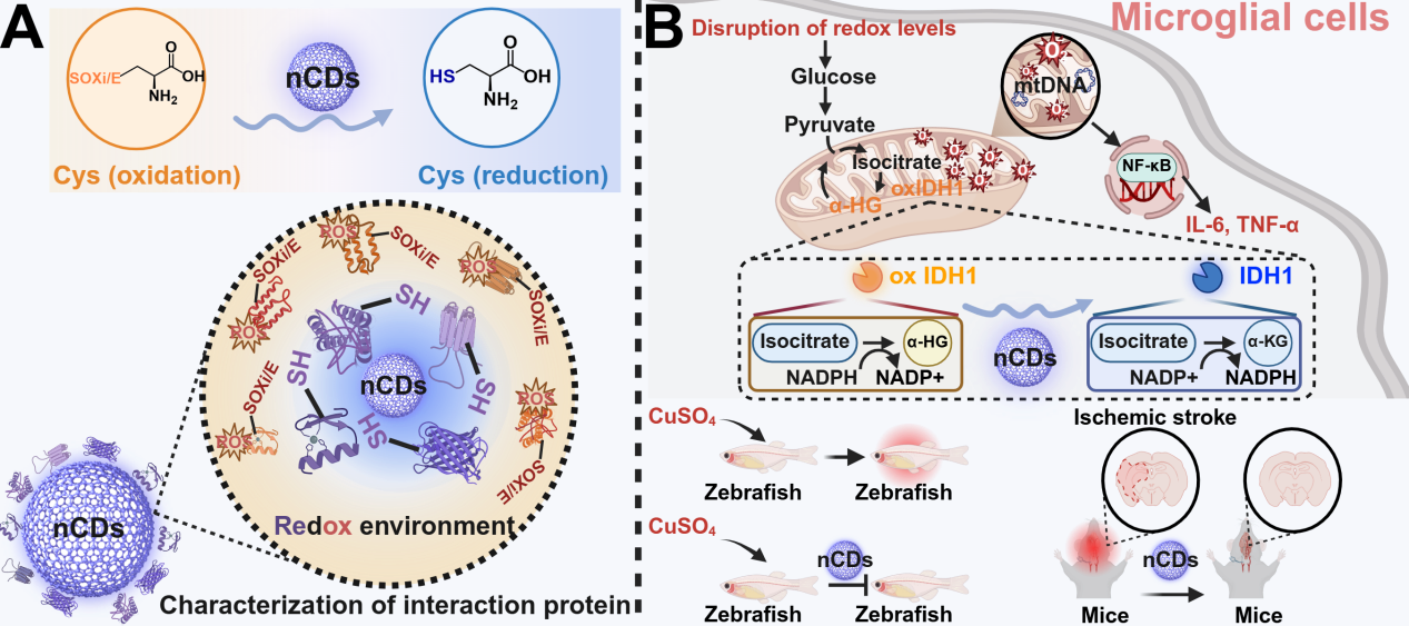 曾克武与屠鹏飞团队首先以野马追为碳源,采用溶剂热的方法成功制备出碳量子点,随后采用氧化还原蛋白质组学策略鉴别出IDH1为其关键的结合蛋白。进一步研究发现,碳量子点通过选择性逆转IDH1的NADP+识别结构域的构象恢复IDH1的酶活性,进而维持线粒体的完整性并抑制mtDNA-cGAS-STING信号通路的激活,最终在斑马鱼的OGD/R模型及小鼠的MCAO模型上证实了nCDs具有抗脑缺血损伤的作用。该研究不仅揭示了中药碳量子点通过调控IDH1的氧化/还原态发挥抗脑缺血损伤的分子机制,也为脑缺血损伤的治疗提供了新的潜在靶点。