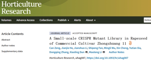 近日,栗茂腾教授团队联合中国农业科学院油料作物研究所的顿小玲研究员在HORTICULTURE领域排名第1的Horticulture Research期刊发表了题为“A Small-scale CRISPR Mutant Library in Rapeseed of Commercial Cultivar Zhongshuang 11”的研究论文