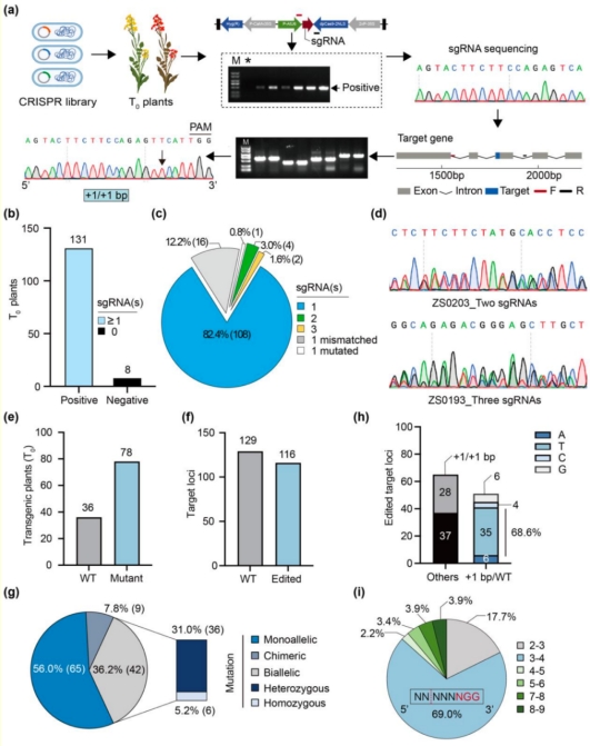 ZS11是我国长江流域主推的优质高产油菜品种,但其遗传转化效率低,尤其是再生困难,限制了其在高通量基因编辑中的应用。本研究首先优化了基于ZS11的再生和遗传遗传转化体系,成功建立了适合ZS11的高效、稳定的遗传转化与再生体系。利用优化后的转化体系,基于前期构建的包含18,414条sgRNA的农杆菌文库对ZS11进行了遗传转化,成功获得了326个T0代转基因株系。对首批139个株系进行分析,发现阳性率达94.2% (图1)。进一步编辑分析表明,在114个株系中,68.4%的植株发生了基因编辑(高于前期J9709库的55.8%)。